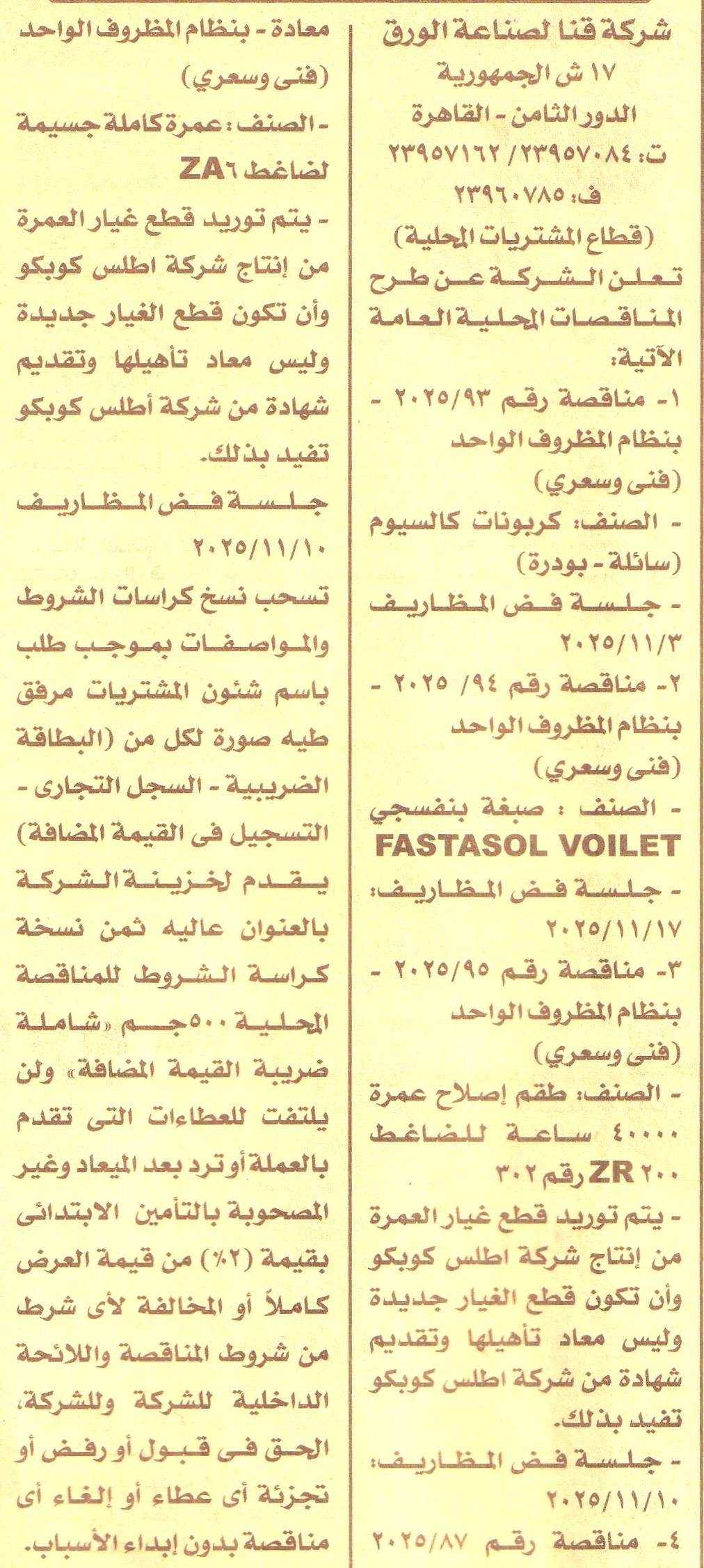 HOT information مناقصة محلية عامة رقم 93/2025 لعملية توريد كربونات كالسيوم (سائلة – بودرة) (للشركة الحق في قبول أو رفض أو تجزئة أي عطاء أو إلغاء المناقصة بدون إبداء الأسباب) عن جريدة الأخبار Post navigation محافظة سوهاج جامعة المنصورة