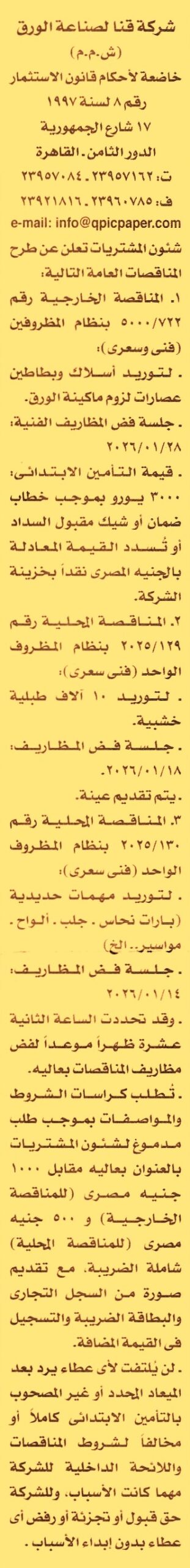 HOT Information مناقصة خارجية عامة رقم 722/5000 لعملية توريد أسلاك وبطاطين عصارات لزوم ماكينة الورق (للشركة الحق في قبول أو رفض أو تجزئة أي عطاء أو إلغاء المناقصة بدون إبداء الأسباب) عن جريدة الأخبار Post navigation مديرية الشئون الصحية بالمنوفية محافظة سوهاج