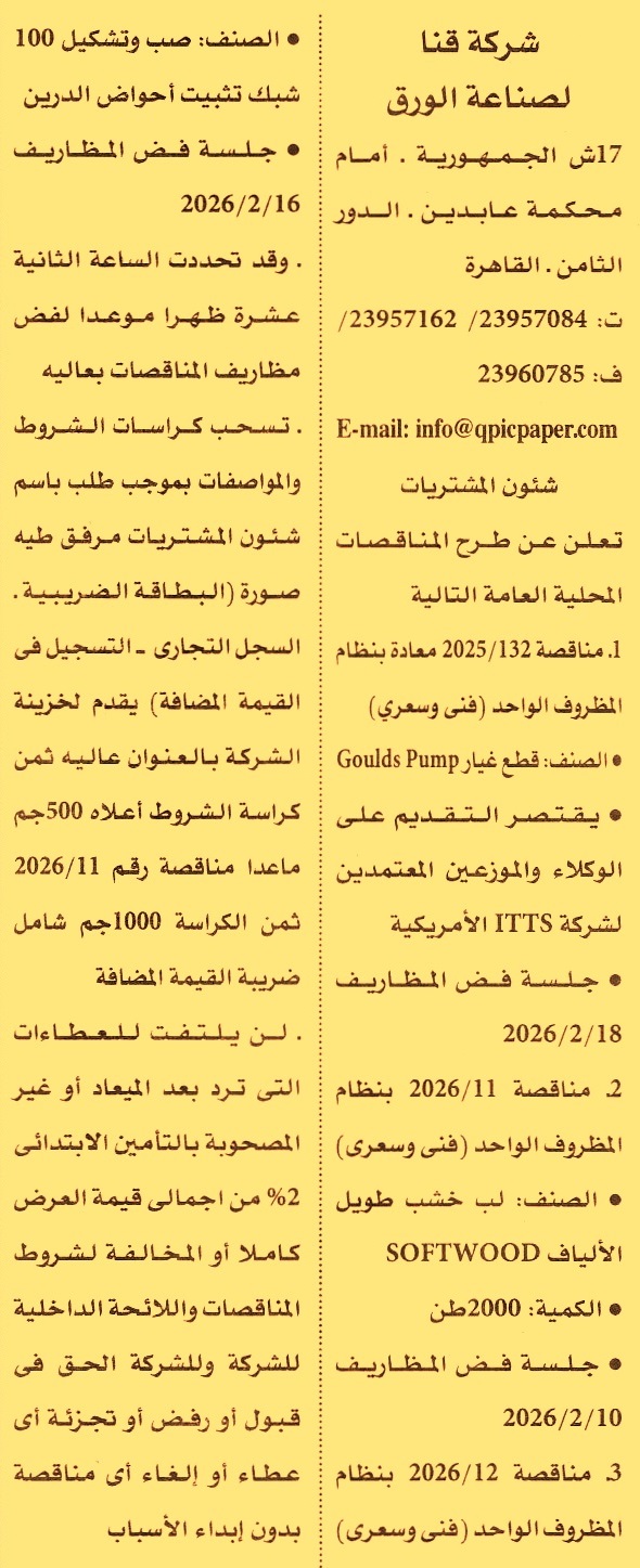 HOT Information إعادة مناقصة محلية عامة رقم 132/2026 لعملية توريد قطع غيار Goulds Pump (بين الوكلاء والموزعين المعتمدين لشركة ITTS الأمريكية وللشركة الحق في قبول أو رفض أو تجزئة أي عطاء أو إلغاء المناقصة بدون إبداء الأسباب) عن جريدة الأهرام Post navigation محافظة الدقهلية شركة الغازات البترولية
