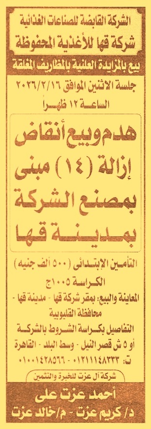HOT Information مزايدة علنية لعملية هدم وبيع أنقاض إزالة 14 مبنى بمصنع الشركة بمدينة قها (المعاينة يوميا من الساعة 8 ص حتى 3 ع ما عدا الجمعة والسبت) عن جريدة الأخبار Post navigation جهاز تنمية مدينة طيبة الجديدة الوحدة المحلية لمدينة رأس سدر