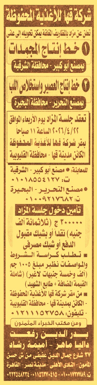 HOT information مزايدة عامة لعملية طرح الأتي (1) خط إنتاج المجمدات بمصنع أبو كبير – محافظة الشرقية (2) خط إنتاج العصير واستخلاص اللب – بمصنع التحرير – محافظة البحيرة عن جريدة الأخبار Post navigation جمعية منابر النور الخيرية بنك مصر