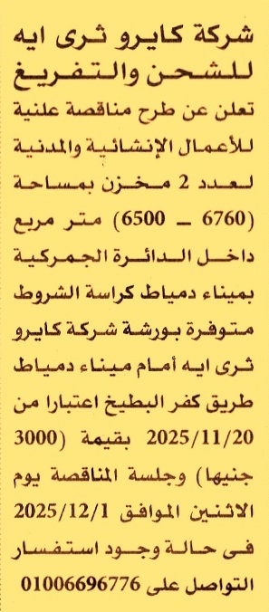 HOT Information مناقصة عامة لعملية تنفيذ الأعمال الإنشائية والمدنية لعدد 2 مخزن بمساحة “6760م2 – 6500م2” داخل الدائرة الجمركية بميناء دمياط عن جريدة الأهرام Post navigation محافظة الغربية رئاسة حي البساتين