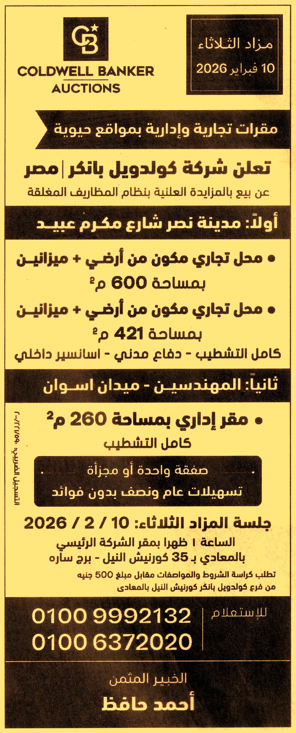 HOT Information مزايدة علنية لعملية بيع الأتي محل تجاري مكون من أرضي وميزانين بمساحة 600م2 ومحل تجاري مكون من أرضي وميزانين بمساحة 421م2 مدينة نصر شارع مكرم عبيد (صفقة واحدة أو مجزأة وبتسهيلات في السداد عام ونصف بدون فوائد) عن جريدة الأهرام Post navigation الوحدة المحلية لمركز ومدينة المنشأة مكتب الخبراء المثمنين شكري ميخائيل سلامة
