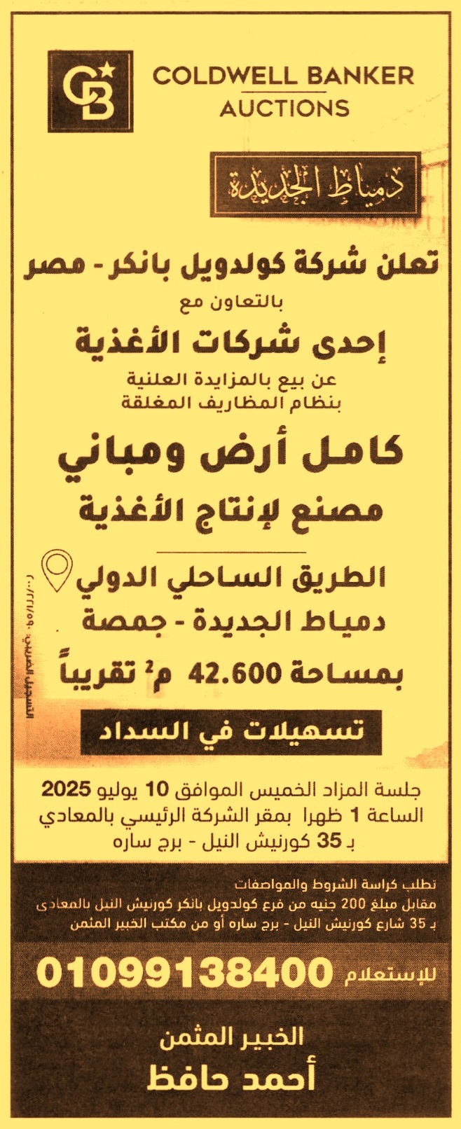 HOT information مزايدة علنية لعملية بيع كامل ارض ومباني مصنع لإنتاج الأغذية على مساحة 42600م2 تقريبا بالطريق الساحلي الدولي – دمياط الجديدة – جمصة (تسهيلات في السداد) عن جريدة الأهرام Post navigation بنك مصر بنك مصر