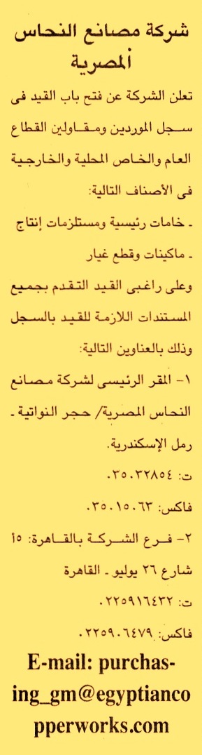 HOT information فتح باب القيد بسجل الموردين والمقاولين في الأصناف التالية (1) خامات رئيسية ومستلزمات إنتاج (2) ماكينات وقطع غيار عن جريدة الجمهورية Post navigation جمعية أحمد عرابي التعاونية الزراعية لاستصلاح وتعمير وتنمية الأراضي شركة مياه الشرب والصرف الصحي بالقليوبية