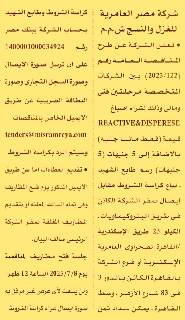 HOT Information مناقصة عامة رقم 122/2025 لعملية توريد أصباغ Reactive & Disperese عن جريدة الأهرام Post navigation محافظة الدقهلية مركز التنمية الشبابية بالتجمع الأول بالقاهرة الجديد