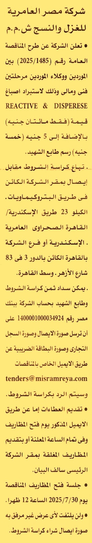 HOT Information مناقصة عامة رقم 1485/2025 لعملية استيراد أصباغ Reactive & Disperese عن جريدة الأهرام Post navigation مركز شباب عزبة نجيب بنك مصر