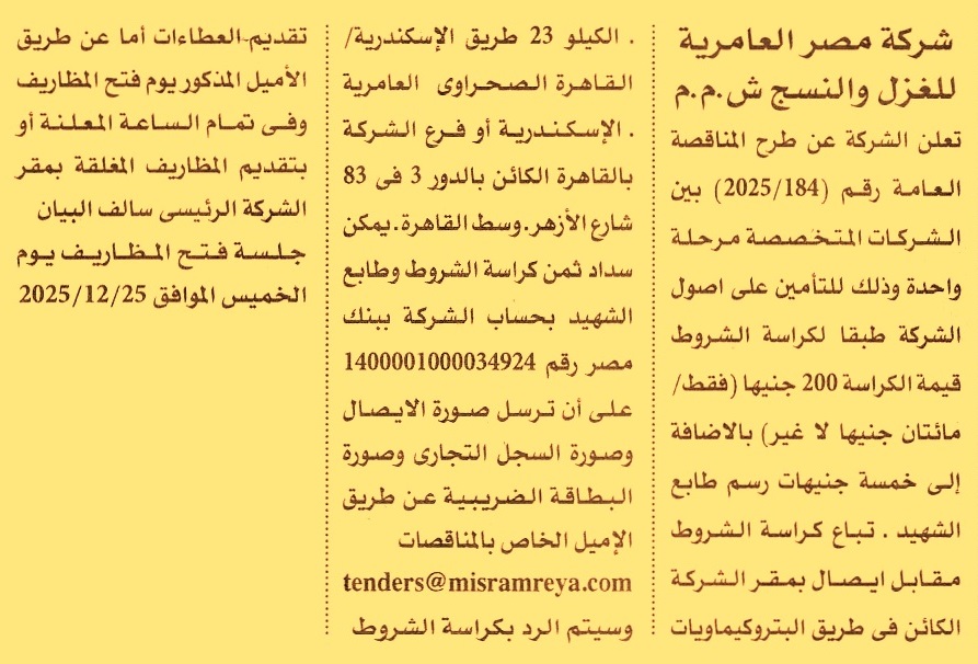 مناقصة عامة رقم 184/2025 لعملية