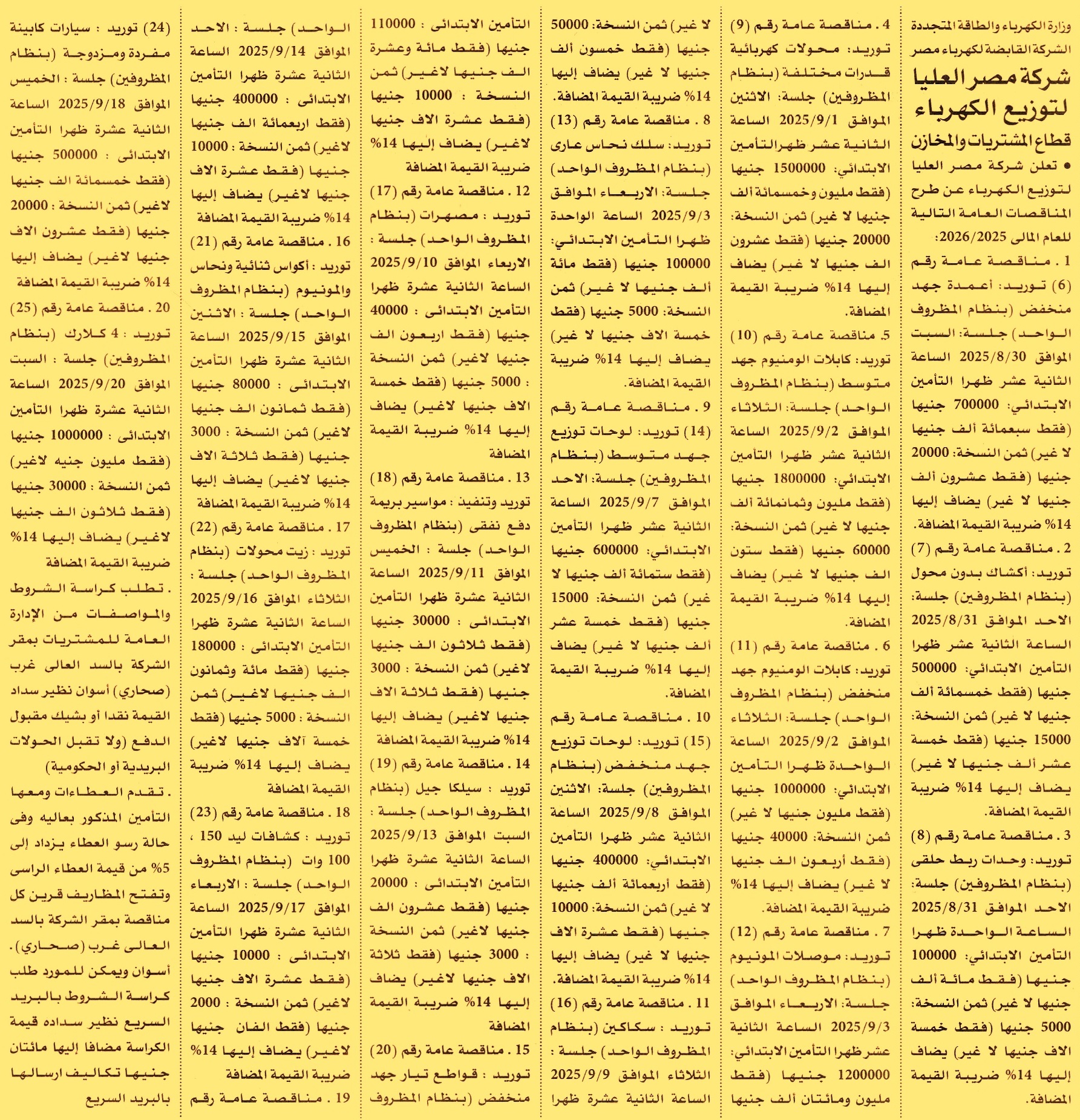 HOT Information مناقصة عامة رقم 6/2025/2026 لعملية توريد أعمدة جهد منخفض عن جريدة الأهرام Post navigation الشركة المصرية للأملاح والمعادن بالفيوم شركة مساهمة البحيرة