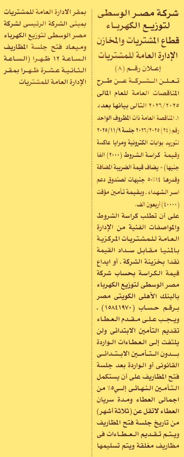 HOT Information مناقصة عامة رقم 24/2025/2026 لعملية توريد بوابات الكترونية ومرايا عاكسة (مدة سريان العطاء 3 أشهر) عن جريدة الأهرام Post navigation شركة الشمس للإسكان والتعمير الهيئة العامة للتنمية السياحية