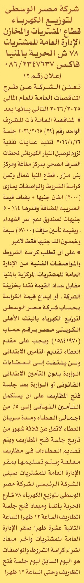 HOT Information مناقصة عامة رقم 29/2025/2026 لعملية تنفيذ عدايات نفقية لزوم توصيل التيار الكهربائي لمحطات الصرف الصحي بمركز مغاغة ومركز بني مزار – قطاع المنيا شمال (مدة سريان العطاء 3 أشهر) عن جريدة الأهرام Post navigation محافظة سوهاج شركة جنوب القاهرة لتوزيع الكهرباء