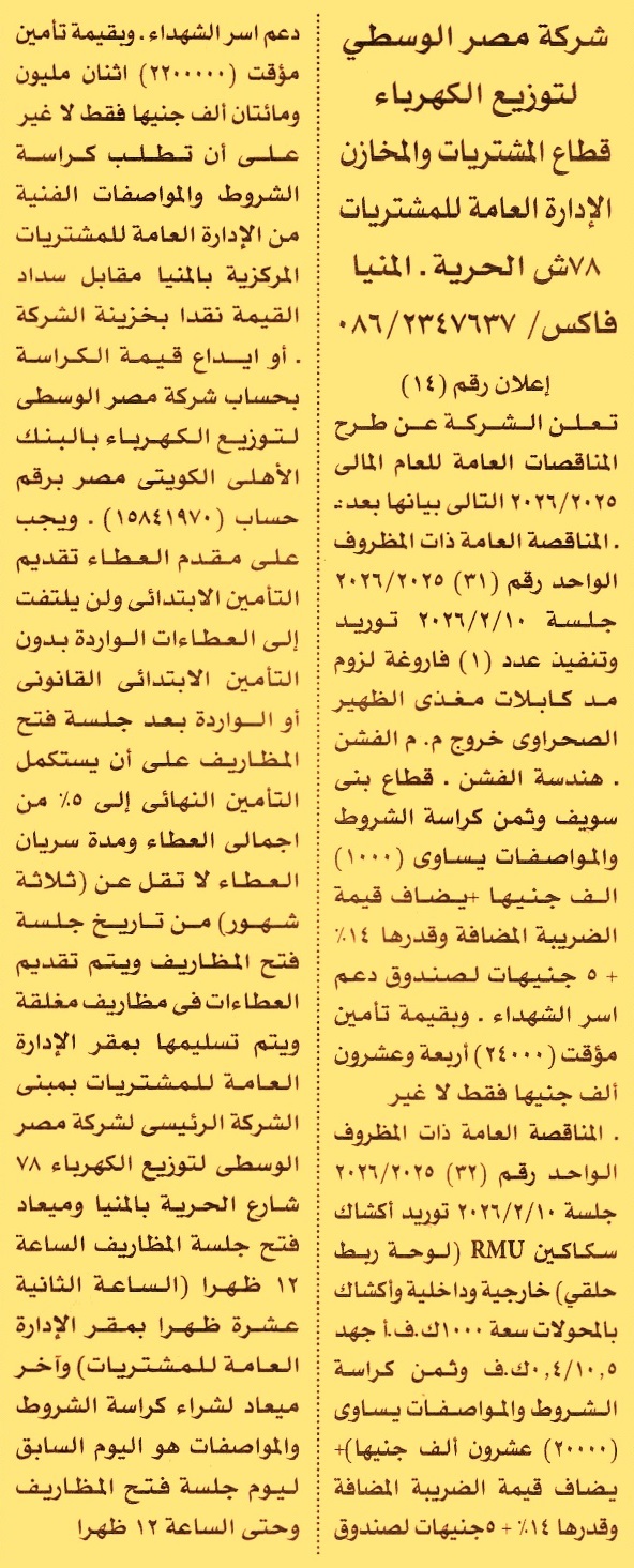 HOT Information مناقصة عامة رقم 31/2025/2026 لعملية توريد وتنفيذ عدد 1 فاروغة لزوم مد كابلات مغذي الظهير الصحراوي خروج م.م الفشن – هندسة الفشن – قطاع بني سويف (مدة سريان العطاء 3 أشهر) عن جريدة الأهرام Post navigation جامعة قناة السويس جهاز تنمية مدينة العبور