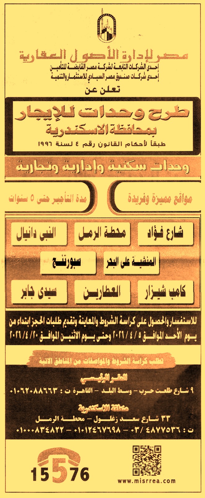 (للإستفسار وشراء الكراسة والمعاينة وتقديم طلبات الحجز من يوم 5/4/2026 حتى يوم 20/4/2026)