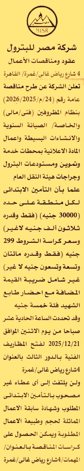 HOT Information مناقصة عامة رقم 24/م/2025/2026 لعملية تنفيذ أعمال الصيانة السنوية والإنشاءات البسيطة وأعمال المادة الإعلانية بمحطات خدمة وتموين ومستودعات البترول وجراجات هيئة النقل العام (يرفق مع المستندات سابقة أعمال) عن جريدة الأهرام Post navigation وزارة الموارد المائية والري شركة مطاحن شرق الدلتا