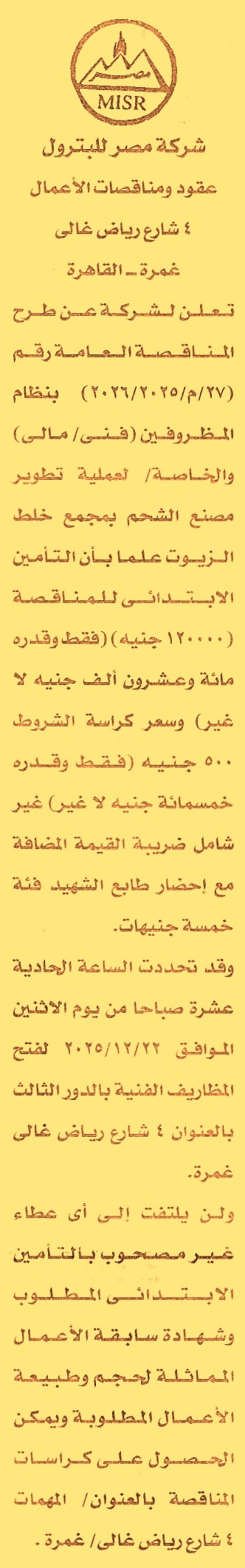 HOT Information مناقصة عامة رقم 27/م/2025/2026 لعملية تطوير مصنع الشحم بمجمع خلط الزيوت (يرفق مع المستندات سابقة أعمال) عن جريدة الأخبار Post navigation بنك مصر مديرية الصحة بالقليوبية