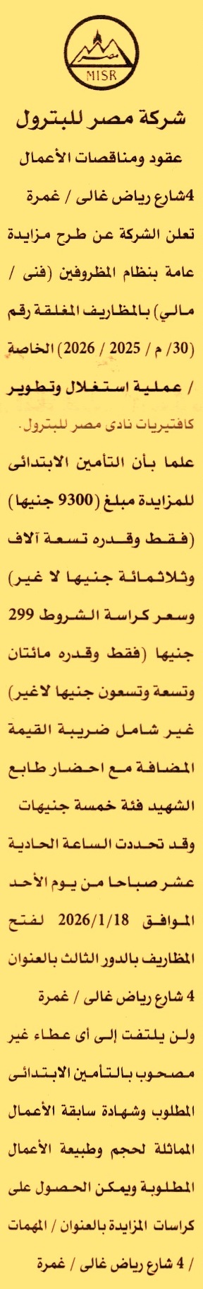 HOT Information مزايدة عامة رقم 30/م/2025/2026 لعملية استغلال وتطوير كافتيريا نادي مصر للبترول (يرفق مع المستندات سابقة أعمال) عن جريدة الأهرام Post navigation مديرية المساحة بأسوان شركة الإسكندرية للبترول