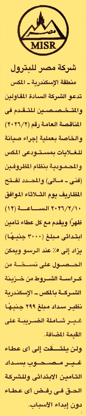 HOT Information مناقصة عامة رقم 2/2026 لعملية تنفيذ أعمال صيانة للغلايات بمستودعي المكس والمحمودية (للشركة الحق في رفض أي عطاء بدون إبداء الأسباب) عن جريدة الجمهورية Post navigation جهاز تنمية مدينة 6 أكتوبر الإدارة العامة لصرف جنوب الجيزة