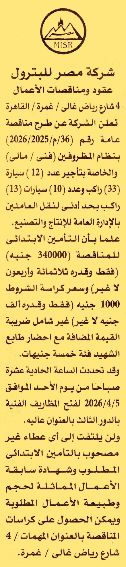 HOT Information مناقصة عامة رقم 36/م/2025/2026 لعملية تأجير 12 سيارة 33 راكب وعدد 10 سيارات 13 راكب بحد أدنى لنقل العاملين بالإدارة العامة للإنتاج والتصنيع (يرفق مع المستندات سابقة أعمال) عن جريدة الأهرام Post navigation مكتب النائب العام الإدارة العامة لصرف شمال قنا