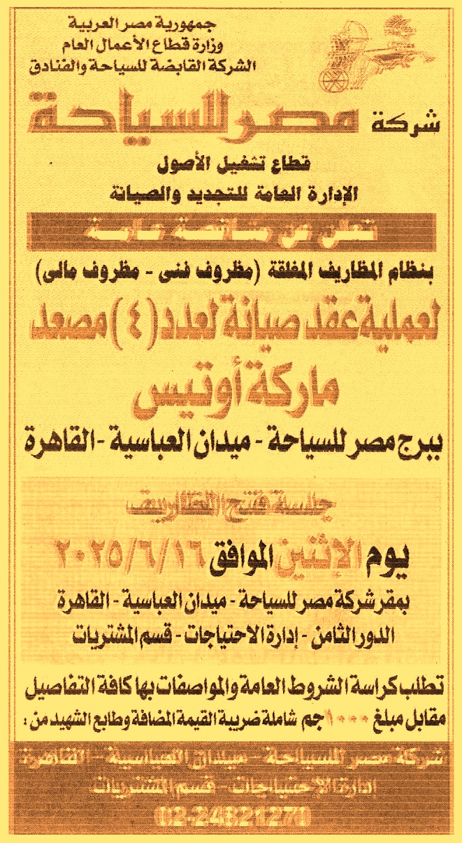 HOT Information مناقصة عامة لعملية إبرام عقد صيانة لعدد 4 مصعد ماركو أوتيس ببرج مصر للسياحة – ميدان العباسية – القاهرة عن جريدة الجمهورية Post navigation رئاسة حي المعادي الهيئة القومية لسكك حديد مصر