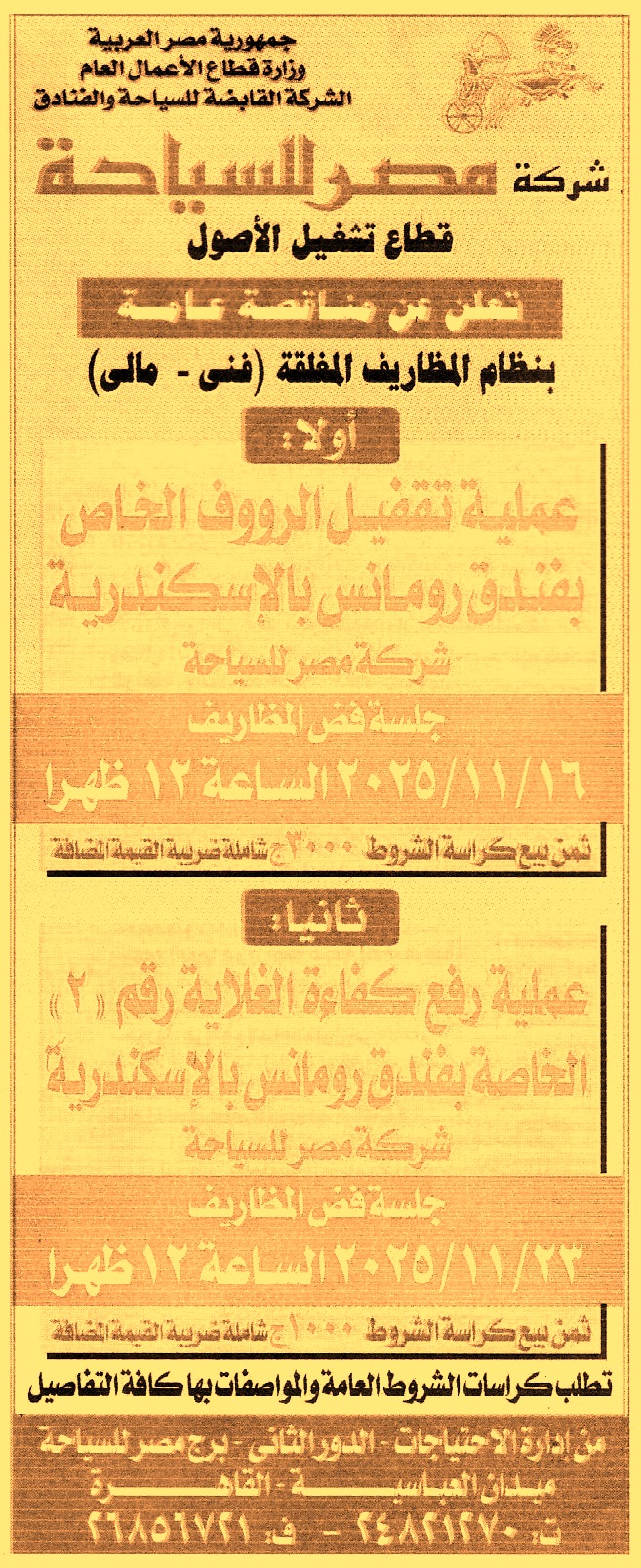 HOT Information مناقصة عامة لعملية تنفيذ أعمال تقفيل الرووف الخاص بفندق رومانس بالإسكندرية عن جريدة الجمهورية Post navigation نادي المصانع الحربية البنك الأهلي المصري