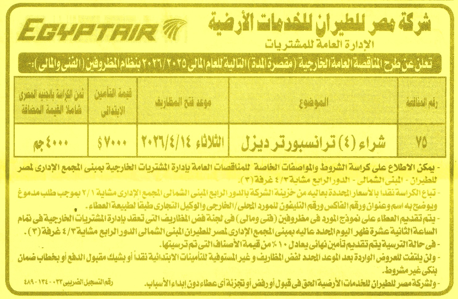 مناقصة عامة خارجية مقصرة المدة رقم 75/2025/2026 لعملية