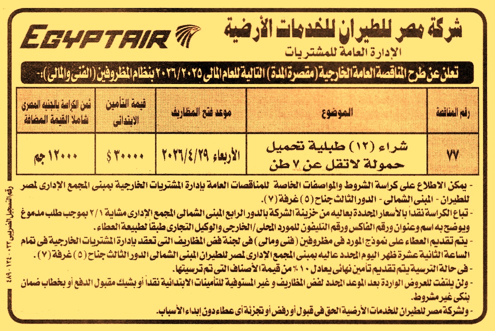 HOT information مناقصة عامة خارجية مقصرة المدة رقم 77/2025/2026 لعملية توريد 12 طبلية تحميل حمولة لا تقل عن 7 طن (للشركة الحق في قبول أو رفض أو تجزئة أي عطاء بدون إبداء الأسباب) عن جريدة الأهرام Post navigation الهيئة العامة للتنمية الصناعية شركة مصر للطيران للخدمات الأرضية