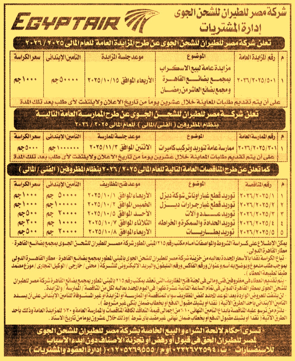 HOT Information ممارسة عامة رقم 301/2025/2026 لعملية توريد وتركيب كاميرات (تقدم طلبات المعاينة خلال 20 يوم من تاريخ الإعلان وللشركة الحق في قبول أو رفض أو تجزئة الأصناف دون إبداء الأسباب) عن جريدة الجمهورية Post navigation الشركة القابضة لمصر للطيران مركز التنمية الشبابية باستاد المنصورة