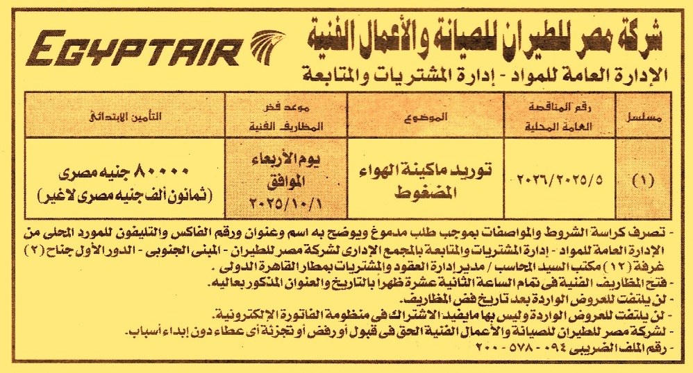 HOT Information ممارسة عامة رقم 5/2024/2025 لعملية توريد ماكينة الهواء المضغوط (للشركة الحق في قبول أو رفض أو تجزئة أي عطاء بدون إبداء الأسباب) عن جريدة الأهرام Post navigation مؤسسة الأهرام الشركة القابضة لمصر للطيران