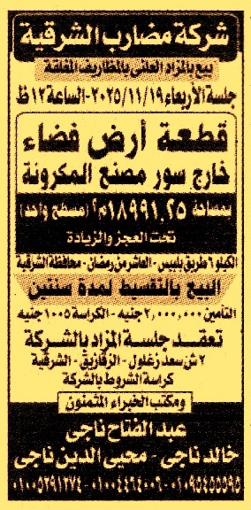 HOT Information مزايدة علنية لعملية بيع قطعة أرض خارج سور مصنع المكرونة بمساحة 18991.25م2 تحت العجز والزيادة “مسطح واحد” والكائنة بالكيلو 6 طريق بلبيس العاشر من رمضان – محافظة الشرقية عن جريدة الجمهورية Post navigation رئاسة مركز ومدينة التل الكبير شركة مصر للمزادات