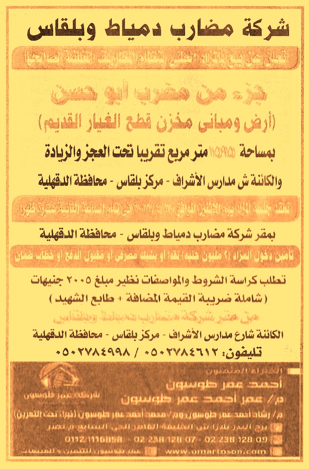 HOT Information مزايدة علنية لعملية بيع جزء من مضرب أبو حسن أرض ومباني مخزن قطع الغيار القديم بمساحة 1595م2 تحت العجز والزيادة “مسطح واحد” والكائنة ش مدارس الأشراف – ببلقاس – محافظة الدقهلية عن جريدة الأخبار Post navigation جمعية الشيخ بدوي الخيرية شركة جنوب الدلتا لتوزيع الكهرباء