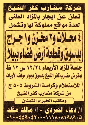 HOT Information مزايدة علنية لعملية تأجير عدد 4 محلات و2 مخزن و1 جراج بدسوق وقطعة أرض فضاء ببيلا عن جريدة الأخبار Post navigation مؤسسة أخبار اليوم محافظة الدقهلية