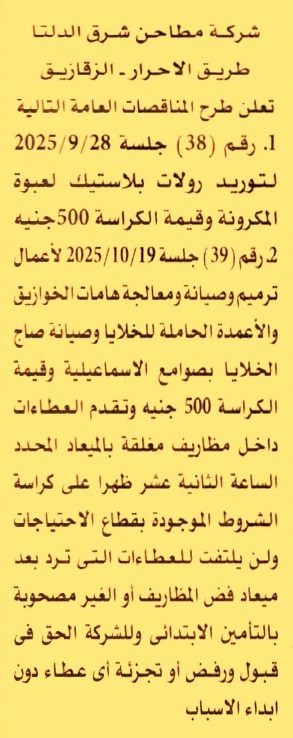 HOT information مناقصة عامة رقم 38 لعملية توريد رولات بلاستيك لعبوة المكرونة (للشركة الحق في قبول أو رفض أو تجزئة أي عطاء دون إبداء الأسباب) عن جريدة الأهرام Post navigation مديرية الإسكان بالغردقة جهاز تنمية مدينة القاهرة الجديدة