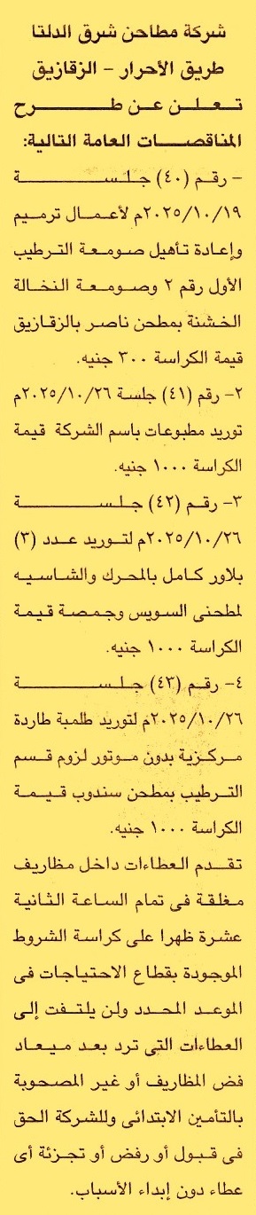 HOT information مناقصة عامة رقم 40 لعملية تنفيذ أعمال ترميم وإعادة تأهيل صومعة الترطيب الأول رقم 2 وصومعة النخالة الخشنة بمطحن ناصر بالزقازيق (للشركة الحق في قبول أو رفض أو تجزئة أي عطاء دون إبداء الأسباب) عن جريدة الجمهورية Post navigation الوحدة المحلية لمركز ومدينة القنطرة غرب الهيئة العامة للاستثمار والمناطق الحرة