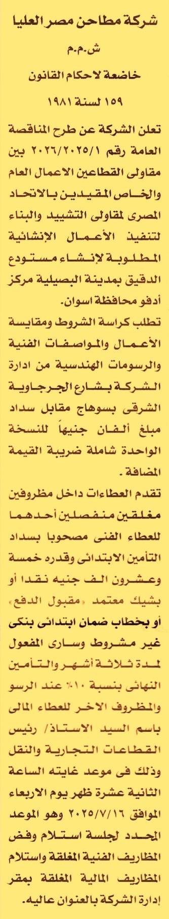 HOT Information مناقصة عامة رقم 1/2025/2026 لعملية تنفيذ الأعمال الإنشائية المطلوبة لإنشاء مستودع الدقيق بمدينة البصيلية بمركز أدفو – محافظة أسوان (مدة سريان خطاب الضمان 3 أشهر) عن جريدة الأخبار Post navigation مركز التنمية الشبابية بالتجمع الأول بالقاهرة الجديد البنك الأهلي المصري