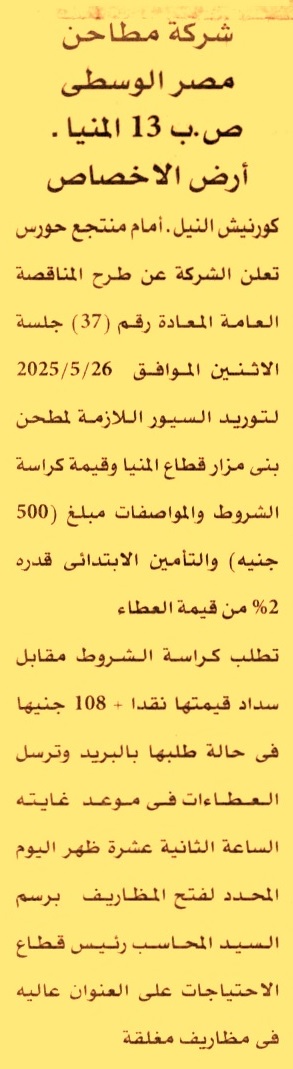 HOT Information إعادة مناقصة عامة رقم 37/2024 لعملية توريد السيور اللازمة لمطحن بني مزار بقطاع المنيا عن جريدة الأهرام Post navigation الهيئة العامة للاستثمار والمناطق الحرة الجمعية المركزية للإصلاح الزراعي بالجيزة
