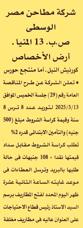 HOT Information مناقصة عامة رقم 29/2024 لعملية توريد عدد 8 ترس 8 سنة عن جريدة الأهرام Post navigation الشركة المصرية لتجارة الجملة شركة مصر العامرية للغزل والنسيج