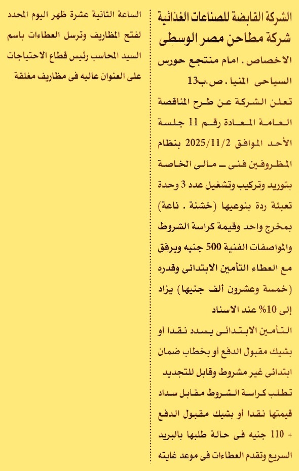 HOT Information إعادة مناقصة عامة رقم 11/2025 لعملية توريد وتركيب وتشغيل عدد 3 وحدة تعبئة ردة بنوعيها “خشنة, ناعمة” بمخرج واحد عن جريدة الأهرام Post navigation الهيئة العامة لنظافة وتجميل القاهرة مستشفى معهد الكبد القومي