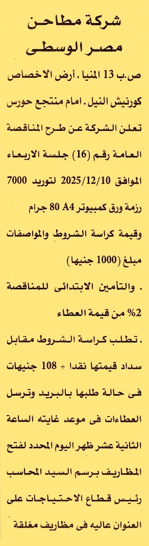 HOT Information مناقصة عامة رقم 16/2025 لعملية توريد 7000 رزمة ورق كمبيوتر A4 80 جرام عن جريدة الأهرام Post navigation شركة ميناء القاهرة الجوي الجمعية التعاونية العامة للإصلاح الزراعي