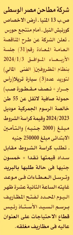 HOT Information إعادة مناقصة عامة رقم 31/2025 لعملية توريد عدد 3 سيارة تريلا “رأس جرار + نصف مقطورة صب” حمولة صافية لا تقل عن 55 طن خالصة الرسوم الجمركية موديل 2023/2024 عن جريدة الأهرام Post navigation شركة طابا للتنمية السياحية مركز التنمية الشبابية بالجزيرة