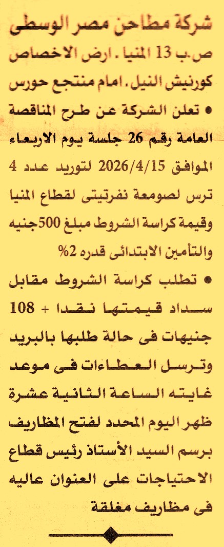 HOT information مناقصة عامة رقم 26/2025 لعملية توريد عدد 4 ترس لصومعة نفرتيتي بقطاع المنيا عن جريدة الأهرام Post navigation جامعة القاهرة – المركز الاجتماعي رئاسة مركز ومدينة المحلة الكبرى