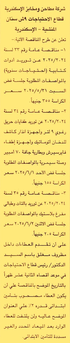 HOT Information مناقصة عامة رقم 33/2024/2025 لعملية توريد أدوات كتابية “احتياجات سنوية” عن جريدة الجمهورية Post navigation شركة الغازات البترولية شركة الزيوت المستخلصة ومنتجاتها