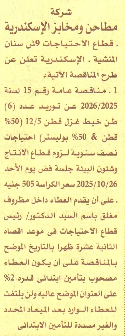 HOT information مناقصة عامة رقم 15/2025/2026 لعملية توريد عدد 6 طن خيط غزل قطن 5/12 (50% قطن 50% بوليستر) احتياجات نصف سنوية لزوم قطاع الإنتاج وشئون البيئة عن جريدة الأهرام Post navigation الإدارة العامة لصرف غرب الفيوم حي العجمي محافظة الأسكندرية