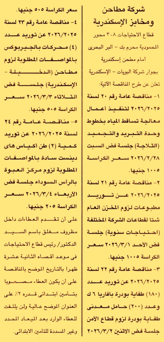 HOT Information مناقصة عامة رقم 20/2025/2026 لعملية تنفيذ أعمال معالجة تساقط المياه بخطوط وحدة التبريد والتجميد “الثلاجة” عن جريدة الجمهورية Post navigation نادي الترسانة الرياضي