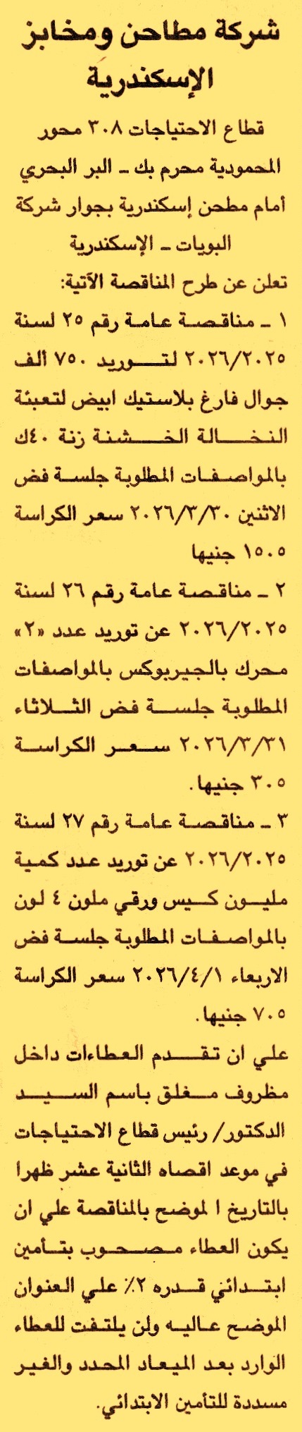 HOT Information مناقصة عامة رقم 25/2025/2026 لعملية توريد كمية 750 ألف جوال فارغ بلاستيك أبيض لتعبئة النخالة الخشنة زنة 40ك عن جريدة الجمهورية Post navigation محافظة سوهاج جهاز تنمية مدينة طيبة الجديدة