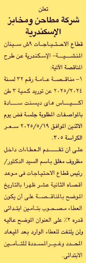 HOT Information مناقصة عامة رقم 32/2024/2025 لعملية توريد كمية 3 طن أكياس هاي ديسنت سادة عن جريدة الجمهورية Post navigation محافظة الإسكندرية الشركة المصرية لإنتاج الأمصال واللقاحات والأدوية