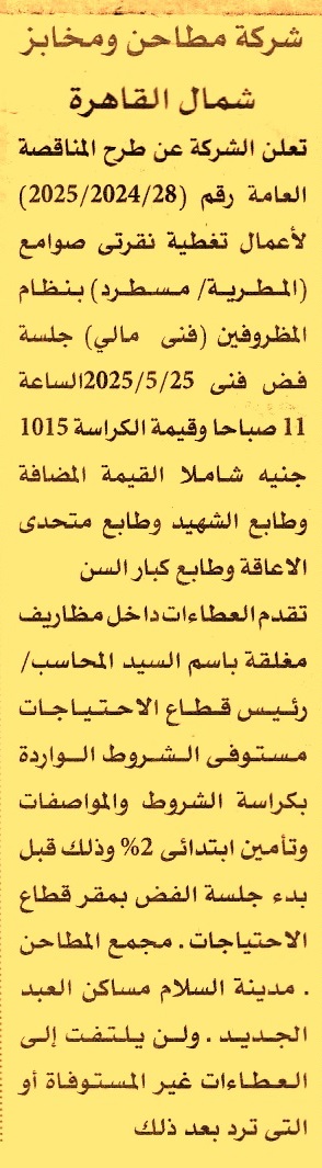 HOT Information مناقصة عامة رقم 28/2024/2025 لعملية تنفيذ أعمال تغطية نقرتي صوامع “المطرية – مسطرد” عن جريدة الأهرام Post navigation المجلس الأعلى للشئون الإسلامية مديرية الشئون الصحية بالغربية