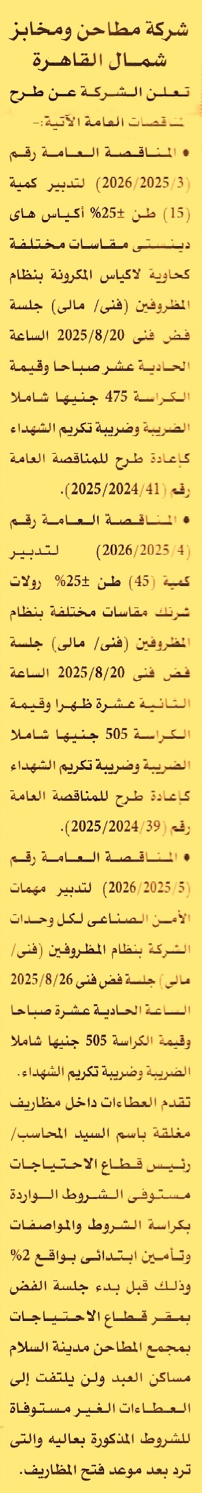 HOT Information مناقصة عامة رقم 3/2025/2026 لعملية توريد كمية 15 طن ± أكياس هاي دينستي مقاسات مختلفة كحاوية لأكياس المكرونة عن جريدة الأهرام Post navigation الوحدة المحلية لمركز ومدينة كفر الدوار رئاسة مركز ومدينة بلبيس