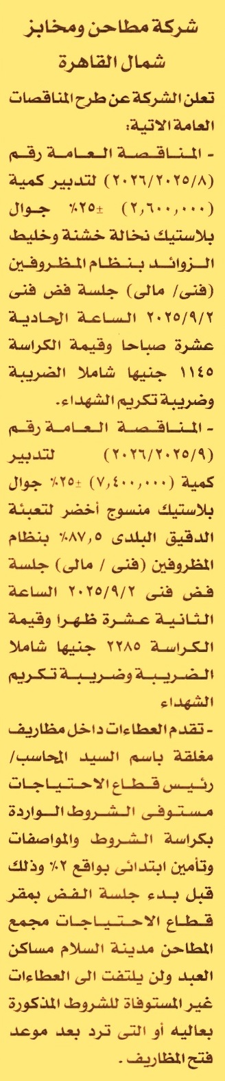 HOT Information مناقصة عامة رقم 8/2025/2026 لعملية توريد 2 مليون و600 ألف ±25% جوال بلاستيك نخالة خشنة وخليط الزوائد عن جريدة الأخبار Post navigation شركة النيل للمجمعات الاستهلاكية الوحدة المحلية لحي غرب سوهاج