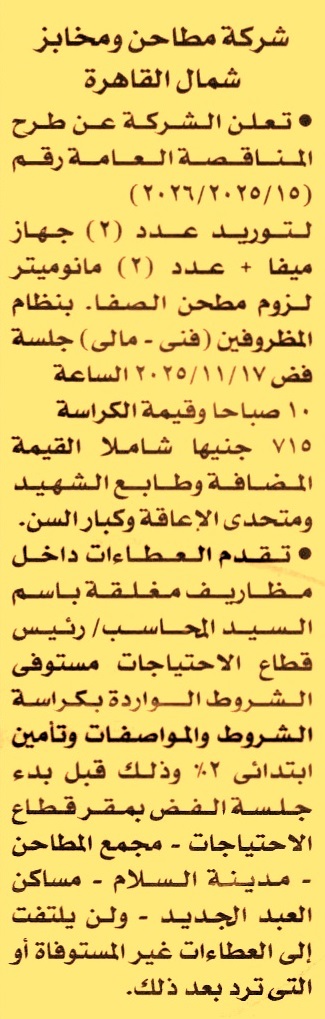 HOT Information مناقصة عامة رقم 15/2025/2026 لعملية توريد عدد 2 جهاز ميفا وعدد 2 مانوميتر لزوم مطحن الصفا عن جريدة الأخبار Post navigation مديرية الشباب والرياضة بالقاهرة جامعة الزقازيق