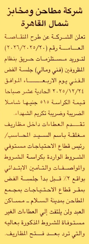 HOT Information مناقصة عامة رقم 20/2025/2026 لعملية توريد مستلزمات حريق عن جريدة الجمهورية Post navigation وزارة الصحة والسكان الهيئة العامة لنقل الركاب بمحافظة الإسكندرية